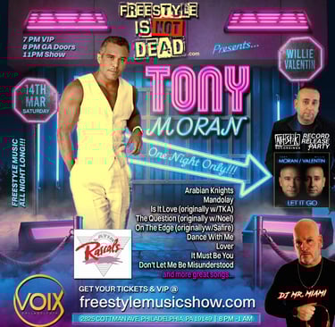 Ladies and gentlemen prepare yourself for an authentic Freestyle Music night as FREESTYLE IS NOT DEAD & DJ MR. MIAMI presents National Recording Artist TONY MORAN (of the LATIN RASCALS) performing all his hits on stage at VOIX (located in Northeast Philly at 2825 Cottman Ave, Philadelphia, PA 19149), on Saturday Night --MARCH 14th 2026 from 8pm - 1am.